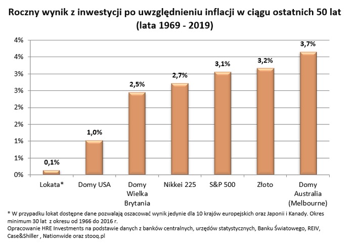 Liczby te znajdują odzwierciedlenie w twardych danych za ostatnie 50 lat. Niestety dane o odpowiednio długiej historii są dostępne tylko dla USA, Wielkiej Brytanii i Australii. Pokazują one, że inwestycja w nieruchomości daje dość przewidywalną stopę zwrotu przekraczającą wzrost cen dóbr i usług (inflację). Do tego ewentualne kryzysy są kilka razy mniej dotkliwe dla wyceny naszego portfela inwestycyjnego niż gdybyśmy oparli go o rynek giełdowy.