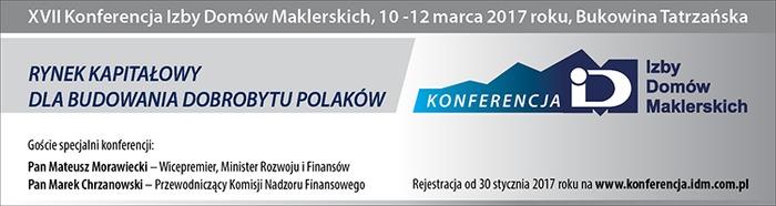 W dniach 10-12 marca 2017 roku w Bukowinie Tatrzańskiej odbędzie się XVII Konferencja Izby Domów Maklerskich, „Rynek kapitałowy dla budowania dobrobytu Polaków”. Gośćmi specjalnymi konferencji będą Mateusz Morawiecki, Wicepremier, Minister Rozwoju i Finansów, Marek Chrzanowski, Przewodniczący Komisji Nadzoru Finansowego, Witold Słowik i Tadeusz Kościński, Podsekretarze Stanu w Ministerstwie Rozwoju. Wydarzenie zostało objęte Patronatem Honorowym Komisji Nadzoru Finansowego.